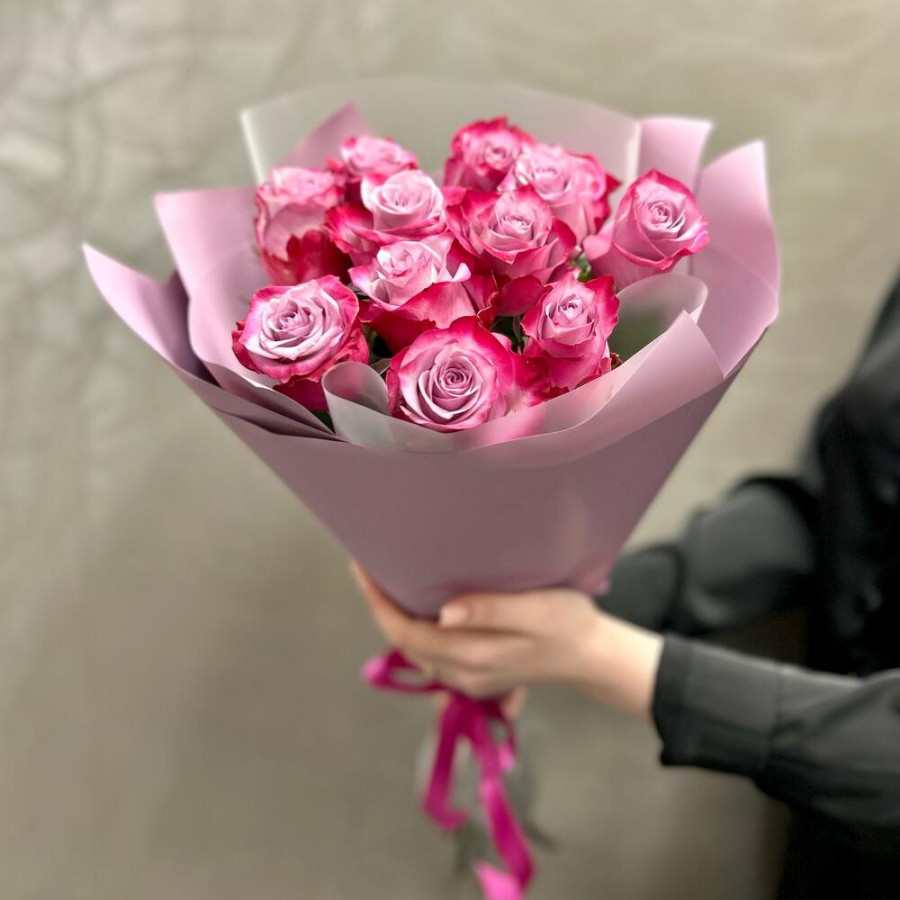 На фото букет из 11 фиолетовых роз. В составе: роза 11 шт, дизайнерская упаковка 1 шт, атласная лента 1 шт, . Все цветы свежие и ароматные, букет красиво оформлен и отлично подходит для подарка. Доступна доставка цветов или самовывоз.