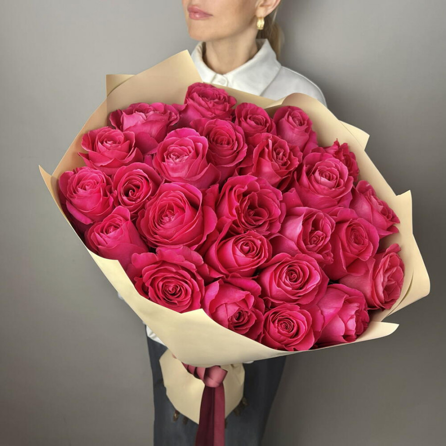 На фото букет из 25 малиновых роз. В составе: роза 25 шт, крафт-бумага 1 шт, атласная лента 1 шт, . Все цветы свежие и ароматные, букет красиво оформлен и отлично подходит для подарка. Доступна доставка цветов или самовывоз.