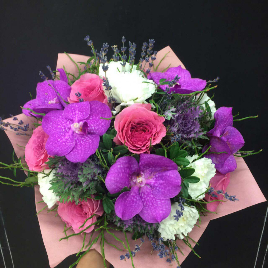 Яркие орхидеи Ванды, словно экзотические бабочки с неповторимым узором на крыльях, в окружении крупных бутонов роз и белых гвоздик, экзотической зелени и лимониума, станут оригинальным подарком на любое торжество и, несомненно, удивят получательницу своими яркими бутонами и неповторимыми сочетаниями сочных красок.
